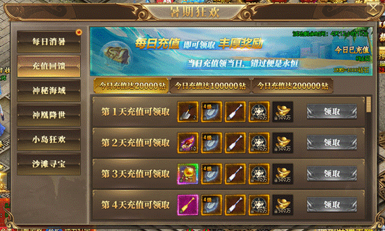 1.每天充值达到指定金额,即可领取丰厚大礼;