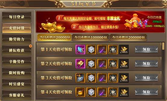 1.每天充值达到指定金额,即可领取丰厚大礼;