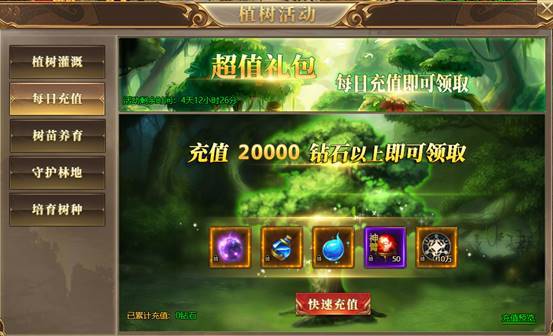 每日充值分为三档:2w钻石,10w钻石,20w钻石,充值达到即可领取对应奖励;
