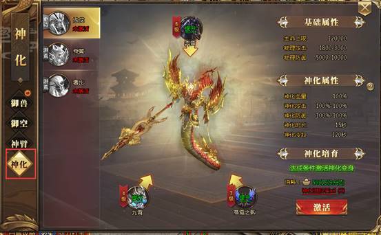 全新系统-神化变身能让玩家化身上古神魔,拥有独立攻防血以及新的技能组,更强的属性,独特的变身技能,专属团队光环,单枪匹马定战局