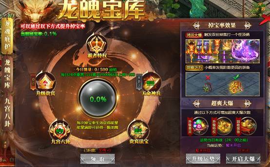 1.龙魂庇护:开服第2天等级达到1500级开启,可通过鸿运大爆、幸运掉落、超爽大爆增加能量获取龙魄。