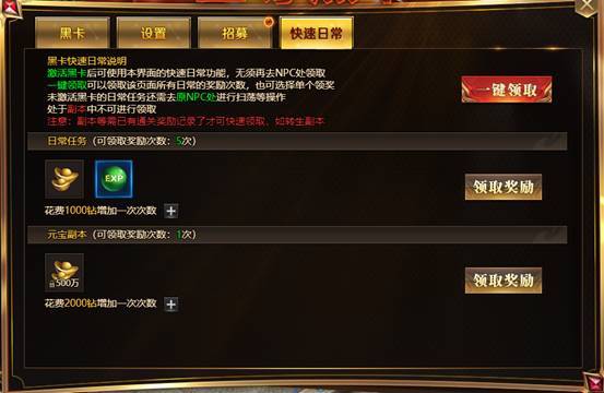 激活黑卡的玩家可一键扫荡日常任务、宝物副本、转生副本、天工试炼等。