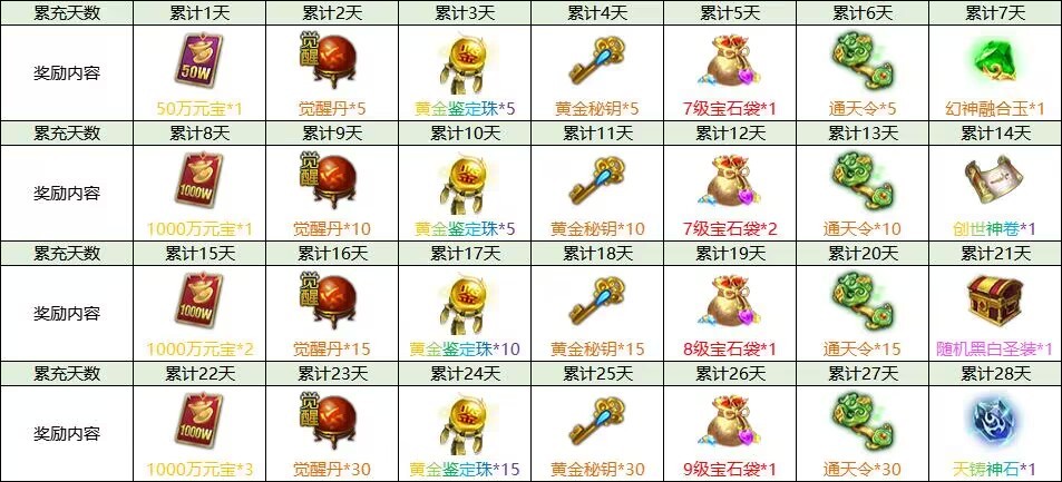 1.每日任意充值即可累计累充天数,达到对应天数即可获得;